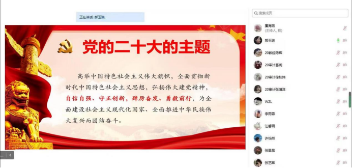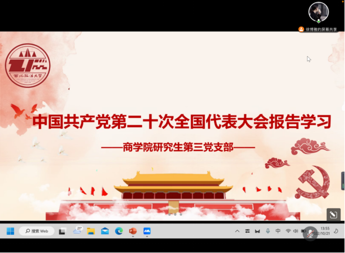 研究生第三党支部组织委员徐博雅主持会议,支部成员集体学习了习近平总书记代表中国共产党第十九届中央委员会向大会所作的报告。会议强调,党的二十大是在全党全国各族人民迈上全面建设社会主义现代化国家新征程、向第二个百年奋斗目标进军的关键时刻召开的一次十分重要的大会,具有重大而深远的意义。与会人员表示,要注重把学习党的二十大精神与提高个人综合素质相结合,切实增强历史使命感和责任感,不忘初心,不辱使命,坚定感恩党、听党话、跟党走的信心和决心,踔厉奋发、勇毅前行,在新时代实现自身成长和为学校创新发展作出应有的贡献,在实现中国梦的生动实践中放飞青春梦想、书写人生华章!