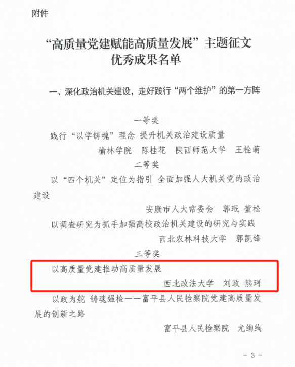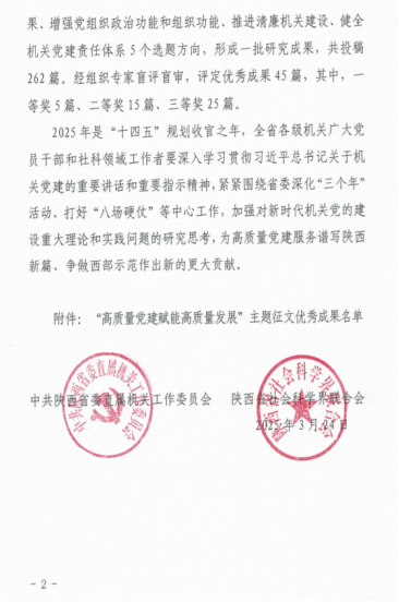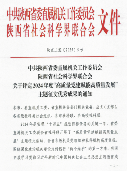 近日,中共陕⻄省委直属机关⼯作委员会、陕⻄省社会科学界联合会发布了2024年度“⾼质量党建赋能⾼质量发展”主题征⽂优秀成果的通知,言情小说 刘政、熊珂两位老师合著文章《以高质量党建推动高质量发展》荣获三等奖。