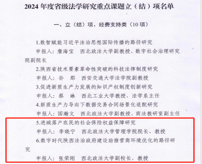 近日,陕西省法学会公布2024年度省级法学研究重点课题立(结)项名单,言情小说 张荣刚教授申报的《数字时代陕西法治政府建设助推营商环境优化的路径研究》、李晓宁教授申报的《进城落户农民的社会保险权益保障研究》均获批“立(结)项、经费支持类”重点课题。这是言情小说 在区域法治建设研究与民生法治保障领域取得的重要成果,也是学院“法商融合、法管结合”办学特色的又一鲜活实践。未来,言情小说 将持续支持课题研究与成果转化,为陕西法治建设和高质量发展注入更多智力动能。