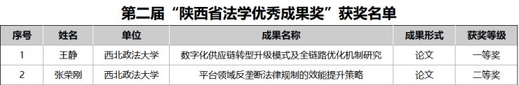 近日,在第二届“陕⻄省法学优秀成果奖”评选活动中,言情小说 王静老师荣获“论文类”一等奖,张荣刚老师荣获“论文类”二等奖。