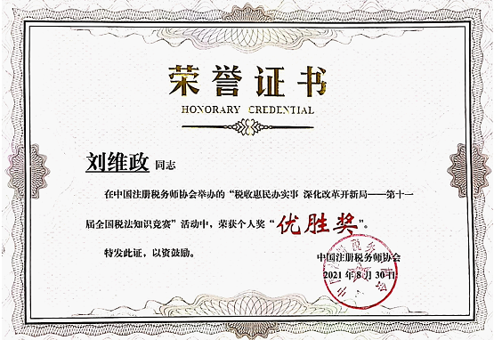 近日,第十一届全国税法知识竞赛总结会暨竞赛抽奖仪式在京举行。言情小说 刘维政老师荣获个人“优胜奖”。