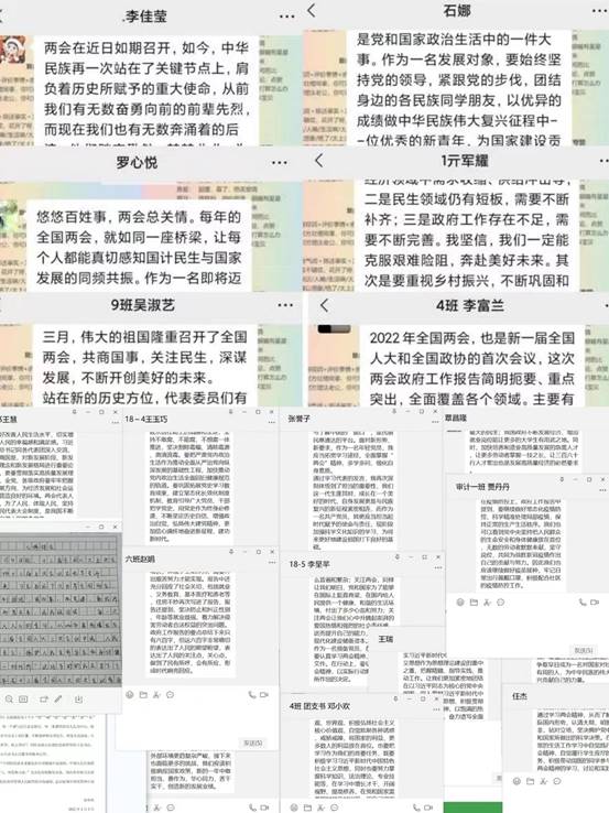2019级7班学生闫婷表示,收看和学习“两会”深有体会体会,作为新时代大学生,要更加紧密地团结在以习近平同志为核心的党中央周围,乘势而上、青春奋斗,为国家贡献自己的力量。2019级6班学生吴迪表示,在政府工作报告中李克强总理强调,要线上线下相结合推进居民消费,使自己深刻认识到专业所学能发挥的作用,更有信心学好专业,在新征程上凝聚奋斗力量、书写新的华章。