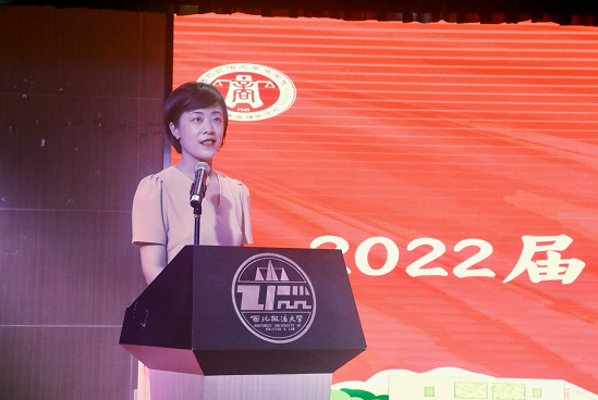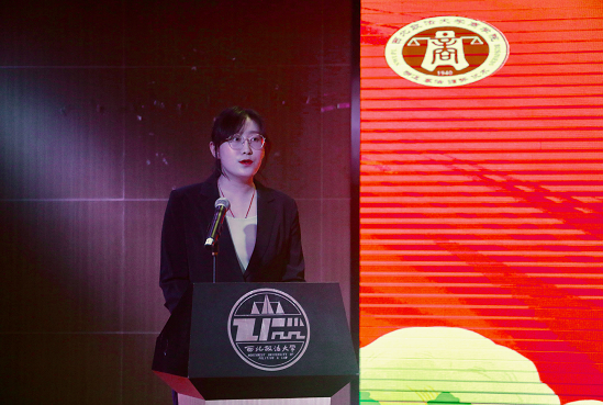 在校学生代表吉予发言。感谢四年来学长学姐们的无私帮助和关心关爱。愿学长学姐们勇敢奔跑在属于自己的人生大路上,勇担青年职责使命,展现西法大人的独特风采。