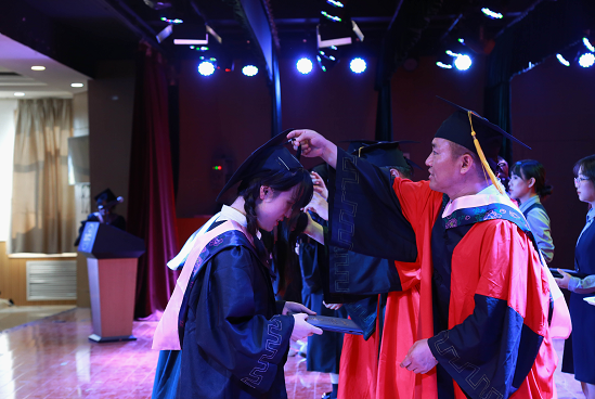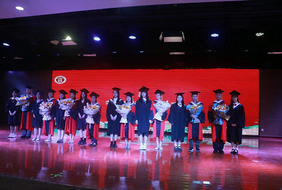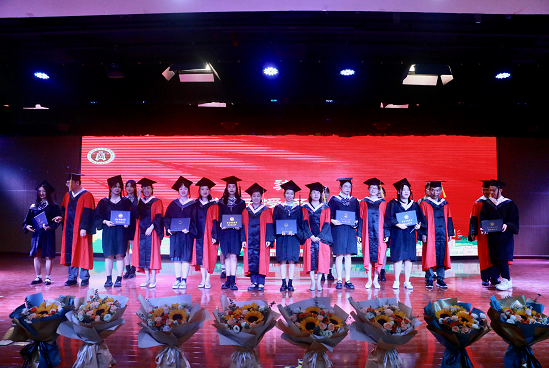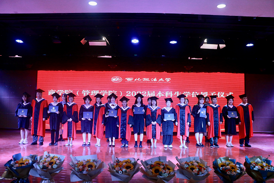 学位授予仪式。毕业生代表向全体学术委员会成员献花合影后,学术委员会成员为2022届毕业生拨穗并颁发学位证书。