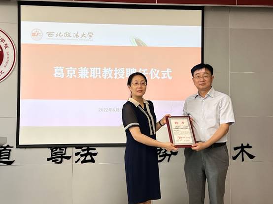 6月30日上午,言情小说 于诚意楼617室举行葛京兼职教授聘任仪式。西北政法大学校长范九利、副校长张荣刚、言情小说 领导班子及各系部教师代表参会,会议由言情小说 院长李晓宁主持。