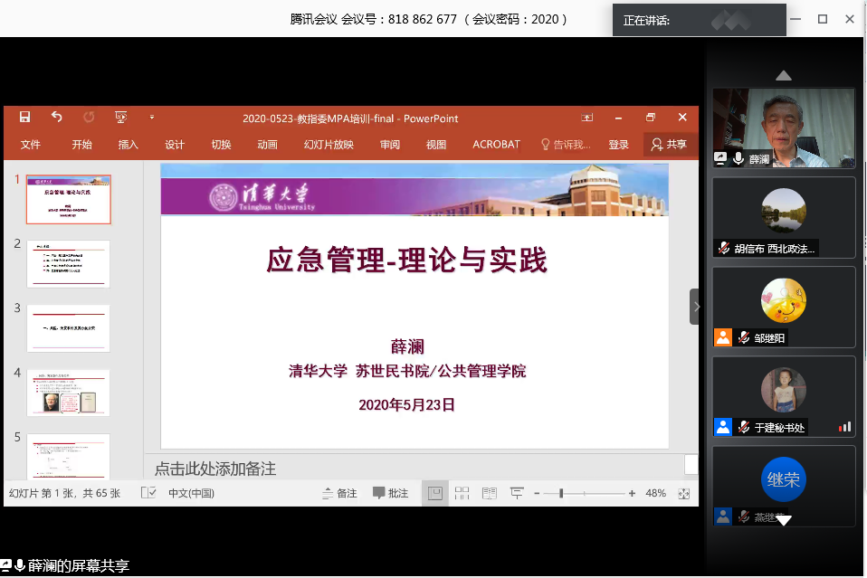 5月23日至24日,公共管理学科选派谢斌、胡信布两位教授参加由全国公共管理硕士(MPA)专业学位教育指导委员会组织主办的“应急管理专业方向建设及师资培训研讨会”。该研讨会采用线上形式举行,共有160余所高校的300多位公共管理领域的专家学者及教师参会。研讨会分为主题报告和分组研讨两个阶段。