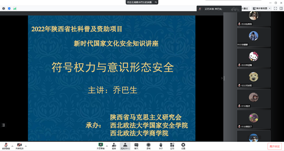 乔巴生老师详细阐述了党的二十大报告中有关意识形态安全方面的内容及建设具有强大凝聚力和引领力的社会主义意识形态的重要性,为同学们研究意识形态安全问题拓宽了思路。同时,希望同学们增强文化自信,坚持以社会主义核心价值观为指引,巩固全党全国各族人民团结奋斗的共同思想基础,增强实现中华民族伟大复兴的精神力量,铸就社会主义文化辉煌。