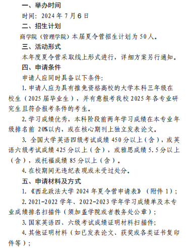 我校今年将举办第五届暑期夏令营。本次夏令营活动申请采取网上报名方式,有意向申请夏令营的学员,可下载填写《申请表》,在规定时间内将相关材料电子版按上述1-4顺序生成压缩文件发至各学院指定邮箱,电子邮件主题和压缩文件名称均为“夏令营申请+现就读本科学校+学生姓名”。发送材料截止日期为2024年6月25日。