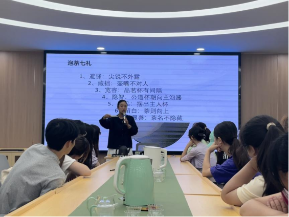 活动中,何珊老师从茶文化核心精神切入,深入解析“和、敬、清、寂”的哲学内涵,结合茶叶历史溯源、品类辨识、传统制作工艺等内容展开系统讲解,引导学生在茶香品鉴中感悟中华传统文化的深邃底蕴,理解其蕴含的价值观念与处世哲学。在实践环节,同学们依次体验温杯洁具、置茶冲泡、分茶奉茶等完整流程,在沉浸式互动中深度感受茶道礼仪的严谨与雅致。