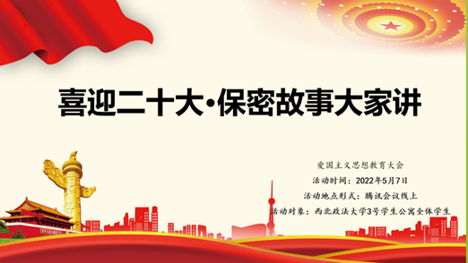 为了激励广大学生弘扬保密工作优良传统,宣传保密法治观念,加强爱国主义、国家安全教育,5月15日下午,在3号宿舍楼组织开展“喜迎二十大·保密工作大家讲”国家安全教育活动,3号宿舍楼全体同学参会。