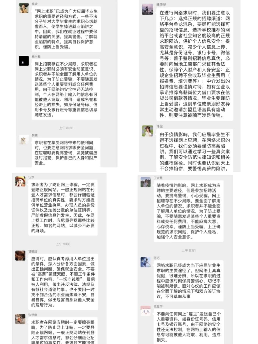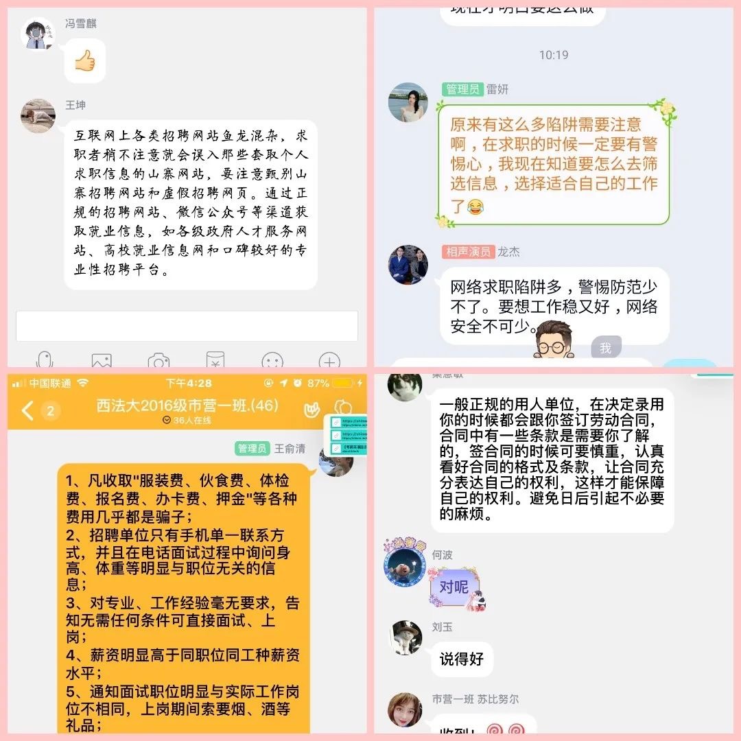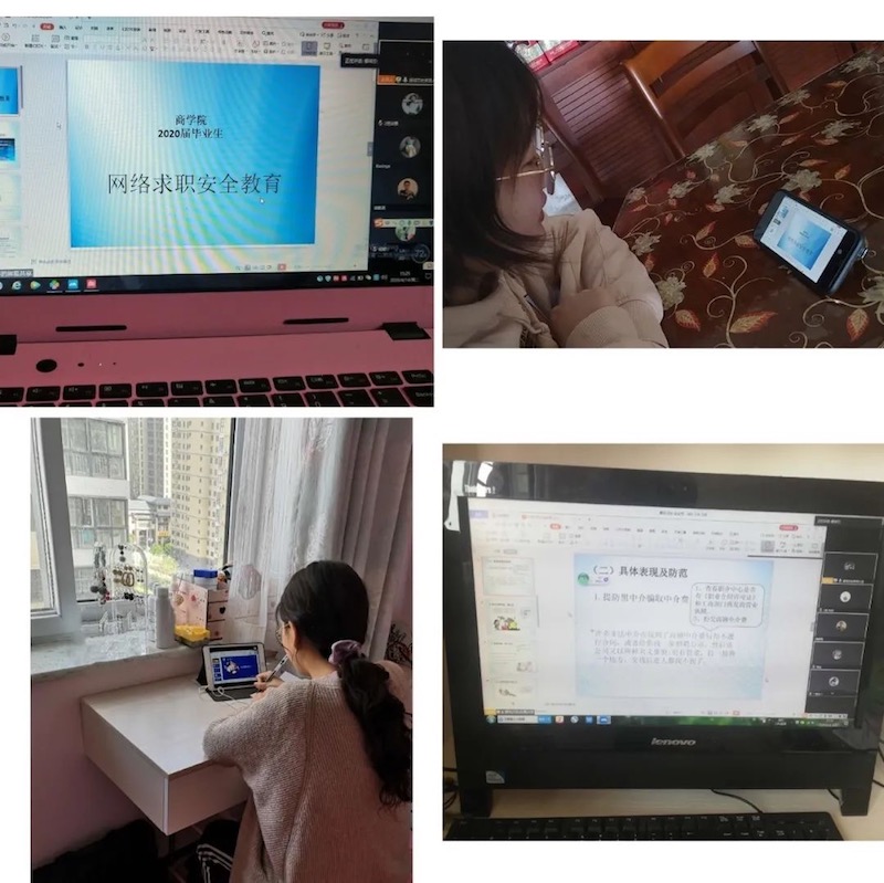 梁菁从人身安全、财产安全、信息安全、智力成果安全、劳动合同安全等方面向同学们分析了求职就业过程中可能会遇到的各项安全隐患,并针对不同类别,向同学们讲授所需要的应对方式、解决办法;结合目前线上求职情况,提醒同学们网络求职要注意保护自己的信息安全、警惕山寨网站、辨别虚假信息等等,并再次提醒同学们,在求职过程中,如有任何疑问,应第一时间与辅导员老师或就创中心老师联系。随后,同学们就网络求职安全进行了讨论,表示在求职过程中,会仔细甄别求职陷阱,始终将安全问题放在首位。