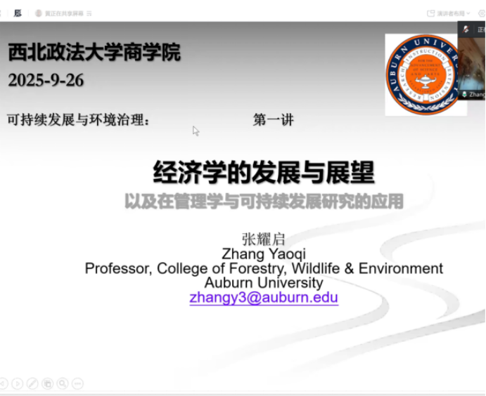 9月26日上午,美国奥本大学(Auburn University)张耀启教授为言情小说 师生开展可持续发展与环境治理系列学术讲座第一讲,讲座主题为“经济学的发展与展望”,副院长冯颖主持,全体研究生及教师参与讲座。
