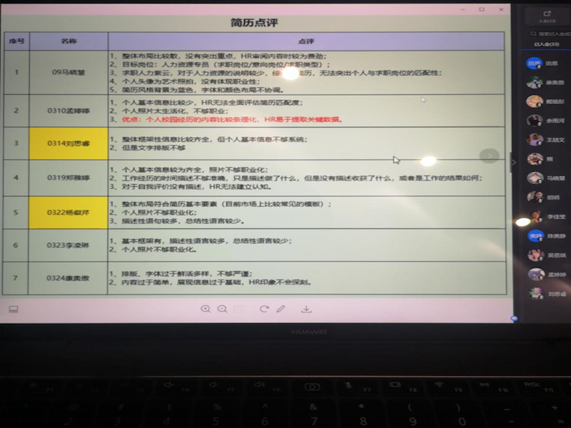 为将专业理论知识融入实践,4月11日晚7点半,《人员素质测评》课程充分利用在线异地联动的便捷性,在“履历分析环节”举行线上简历评析活动。这是受疫情影响,开展线上课堂以来的一次有效尝试。人力资源管理专业老师崔健分别邀请到了目前在西安、深圳和成都工作的2007级熊苏、2008级赵琪、2010级田思和2014级王喆文,四位从事人力资源工作的往届校友作为点评嘉宾,为言情小说 2018级人力资源管理专业学生的简历制作提供模拟专业考核。