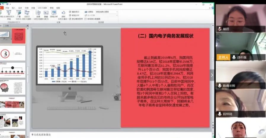线上答辩工作于4月20日上午正式开始,4月26日傍晚顺利结束。学生通过腾讯会议app讲解自己的论文框架、进行ppt展示,听取老师提出的问题和建议。虽然是线上答辩,但毕业生们都展现出了最好的精神面貌,着装整洁、语言表达流畅,就所写论文进行了不同方面的阐述,并较好地回答出老师的问题。老师们也对论文进行认真审查,提出了修改建议和对论文的看法。每个答辩组都配有一名答辩秘书,负责答辩过程记录与时间控制,保证答辩有条不紊地顺利进行。