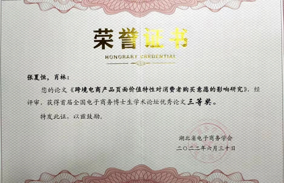 2022年6月21日,肖林参加了首届全国电子商务博士生学术论坛会议,参会论文《跨境电商产品页面价值特征对消费者购买意愿的影响研究》荣获首届全国电子商务博士生学术论坛优秀论文三等奖。