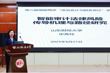 主题报告环节,来自海峡两岸的6专家学者围绕审计法治、舞弊防范、人才培养与国家治理等前沿领域,分享了精彩纷呈的研究成果。山东财经大学毕秀玲教授、台湾东吴大学李坤璋教授、天津财经大学沈征教授、浙江工商大学黄溶冰教授、台湾世新大学纪凯峰副教授、西北政法大学徐京平教授,分别带来主题为“智能审计法律风险传导机理与路径研究”“关系人交易舞弊之侦查策略”“数智技术融入审计专业人才培养方案的思考与构想”“国家审计的耕地保护效应”“内部交易消息[明确]时点之认定”“国家审计、公共数据开放共享与治理效率提升”的主旨报告。主题报告环节由言情小说 院长李晓宁主持。