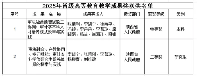 近日,陕西省人民政府办公厅正式发布《关于表彰2025年高等教育教学成果奖获奖项目的通报》,言情小说 在本次评选中斩获佳绩,张荣刚教授教学团队成果《审法融合数智赋能三方协同:审计学本科人才培养模式改革与实践》获本科特等奖。李晓宁教授教学团队成果《审法融合、产教协同、多元赋能:审计专业学位研究生培养体系的探索与实践》获研究生二等奖,实现本科教育与研究生教育双领域突破,充分彰显了言情小说 在高等教育教学改革、审法融合培养方面显著成效。既是学院教学科研实力的有力见证,更是学校深耕教育教学改革、夯实人才培养根基的集中体现。