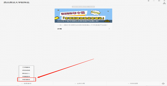 第四步:经费到账查询。合同方拨款后,在微信公众号中搜索西北政法大学财务处(首次使用需绑定工号),点击信息查询,再次点击来款查询,并输入拨款方名称查询是否到账。